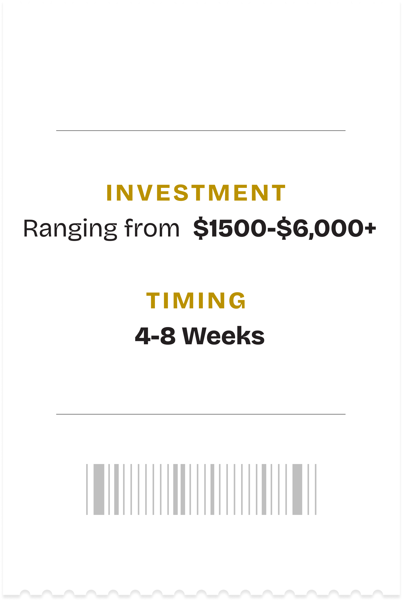 Custom web projects typically take between 3-8 weeks to complete. If you choose to add on a custom website, that will generally add another 6-8 weeks to the timeline (depending on the page count). For combined packages, timelines will overlap and stagger, but rest assured we’ll keep everything moving smoothly and ensure you get the results you’re looking for on time.